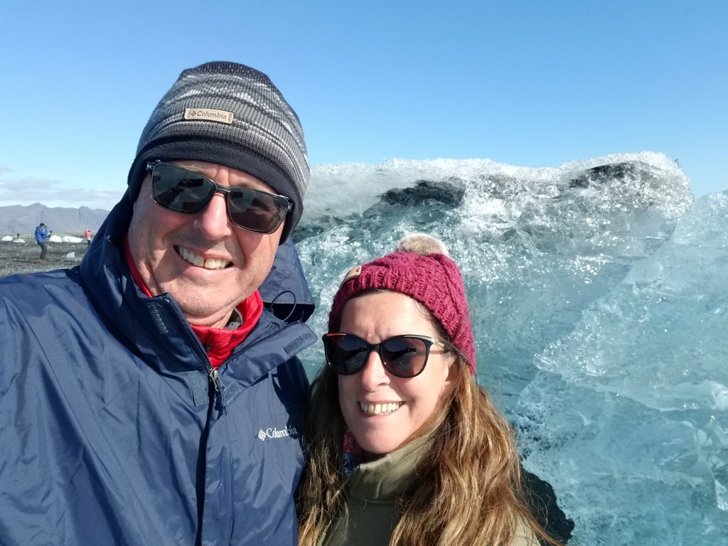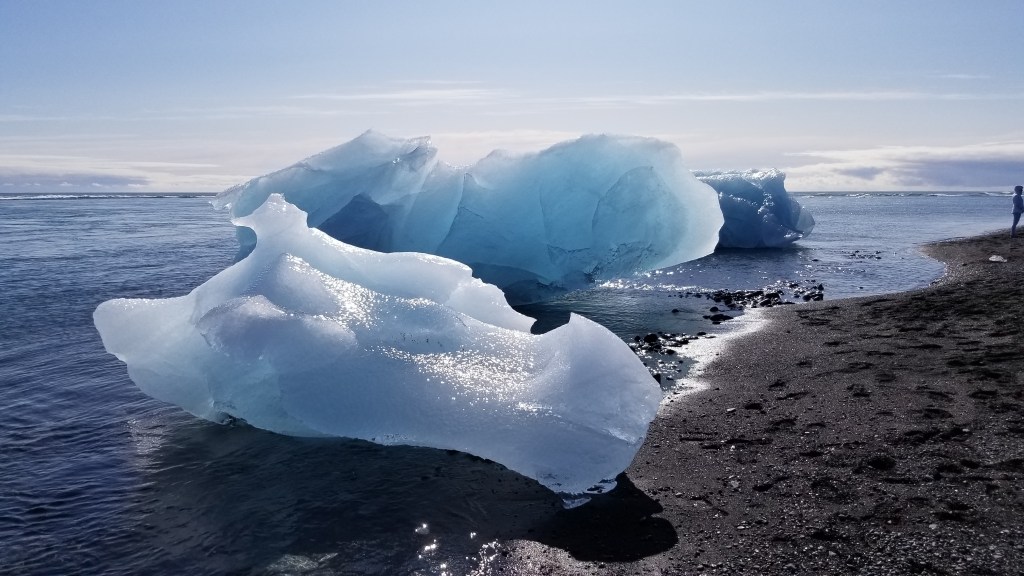 Luego seguimos nuestro recorrido hacia Jokulsarlon y Diamond Beach ahí el espectáculo de los glaciares rompiendo y yéndose hacia el mar fue absolutamente increíble .En general (o mejor dicho los que nosotros vimos) los bloques de hielo quedan en una laguna, pero en este caso se desplazaban a una rápida velocidad, no sé si debido al viento o la corriente de agua, yéndose hacia el mar y algunos quedando estacionados en la playa, donde pudimos tocarlos y por supuesto probar el sabor de ese hielo.