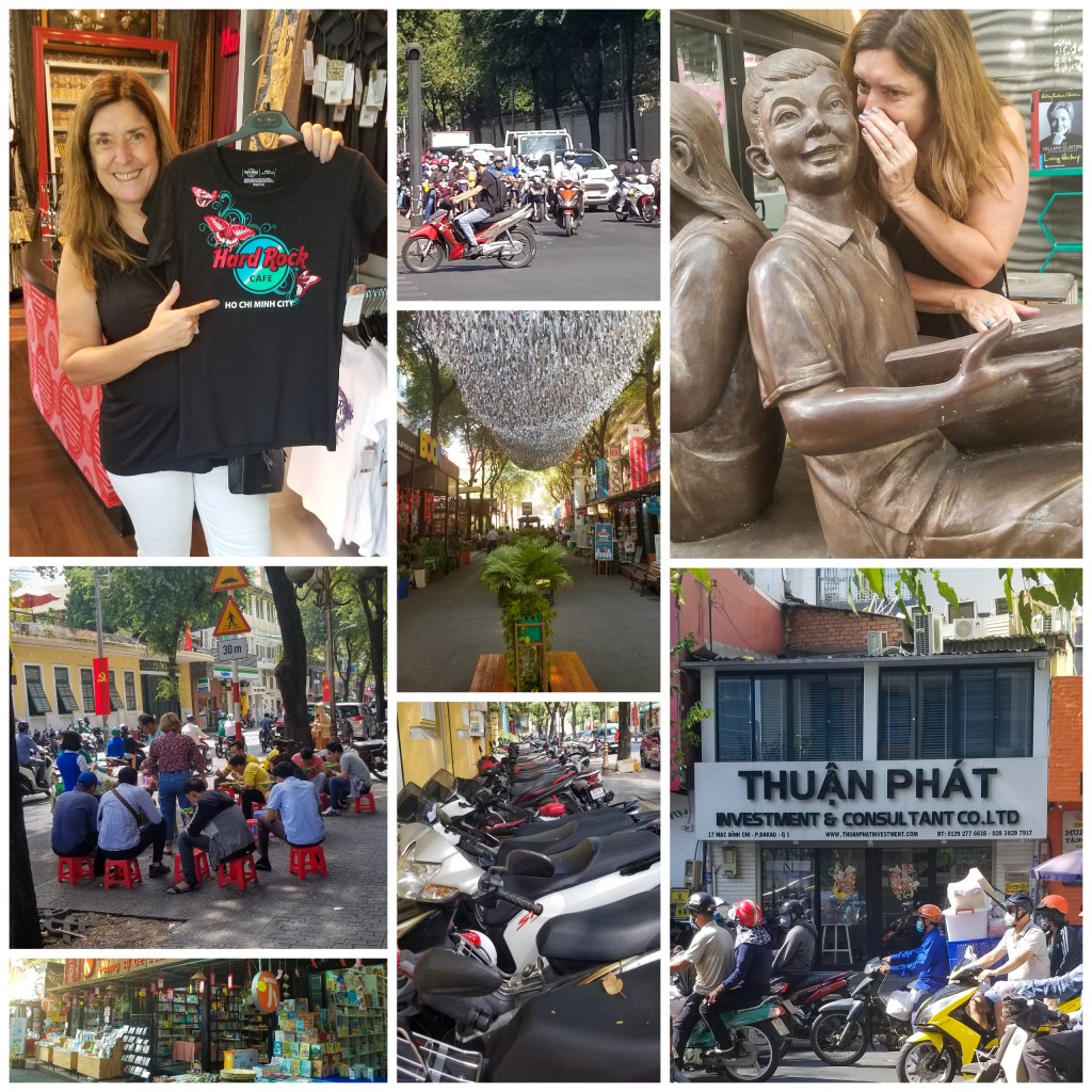 We walked through a street where only sold books were sold, and I was especially happy to be there because it was beautiful and no motorcycles could enter. Motorbikes are used everywhere, which made street crossings feel like adventures: they sideswipe you, you have to walk calmly and never stop; just go, go, go and good luck. The sidewalks are full of parked motorcycles and, as in the picture, you will see vendors cooking on the sidewalk and people sitting around in low seats enjoying lunch. All very different but fun, being a pedestrian could be a high risk activity.