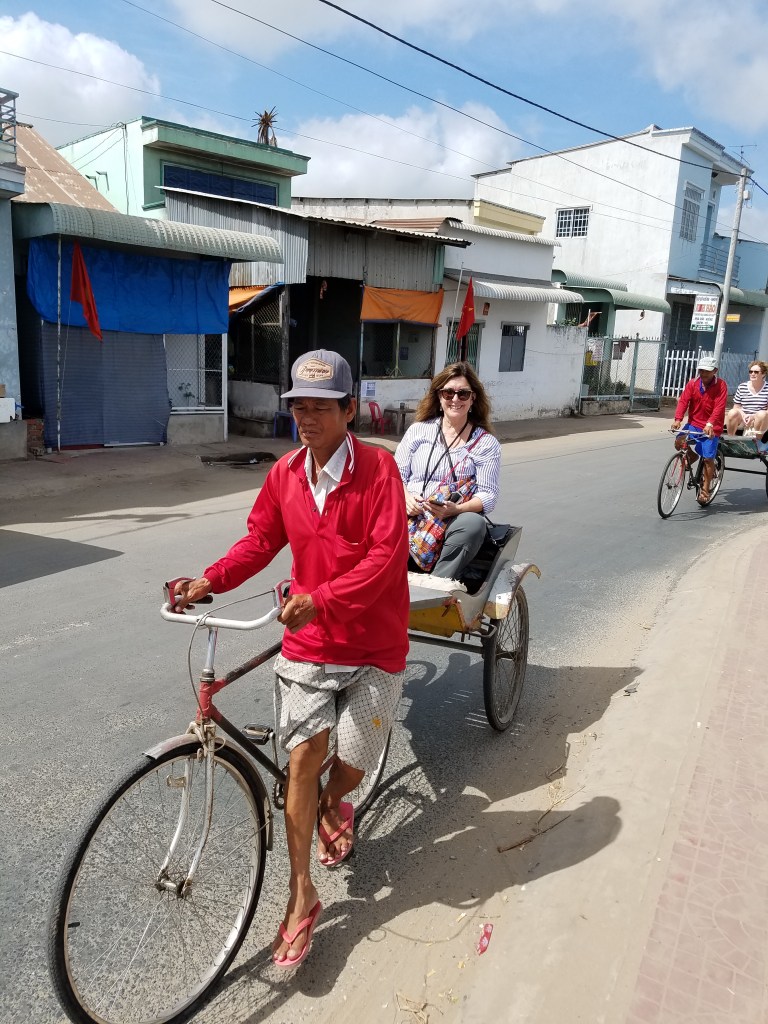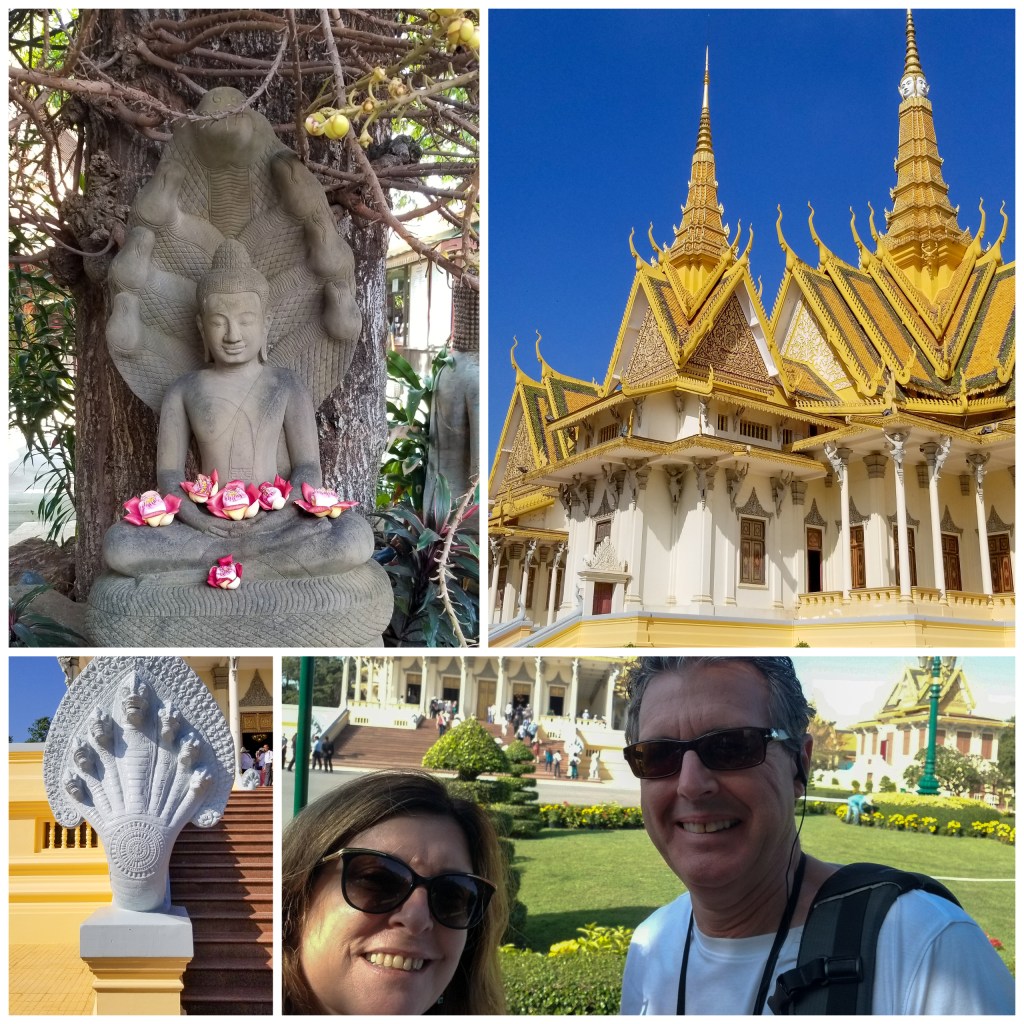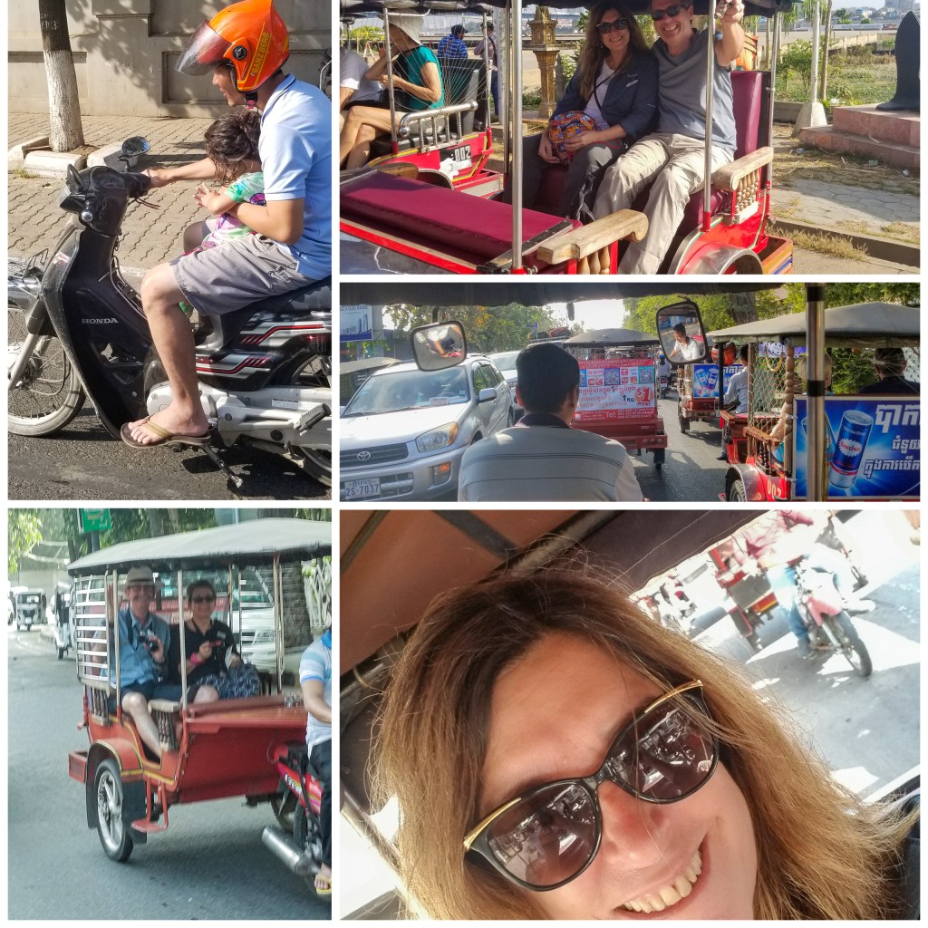 So in the last post we were about to disembark in the port of Phnom Penh. Then we took an excursion around the city by tuk tuk. This is a motor bike with a cart in the back with no windows or doors, it’s like traveling in a bike but more comfortable, but you still have the sensation that the cars, bikes, other tuk tuks are going to hit you. Trust me, there is a lot of fun involved. Here are some pictures where you can see some of our traveling friends.