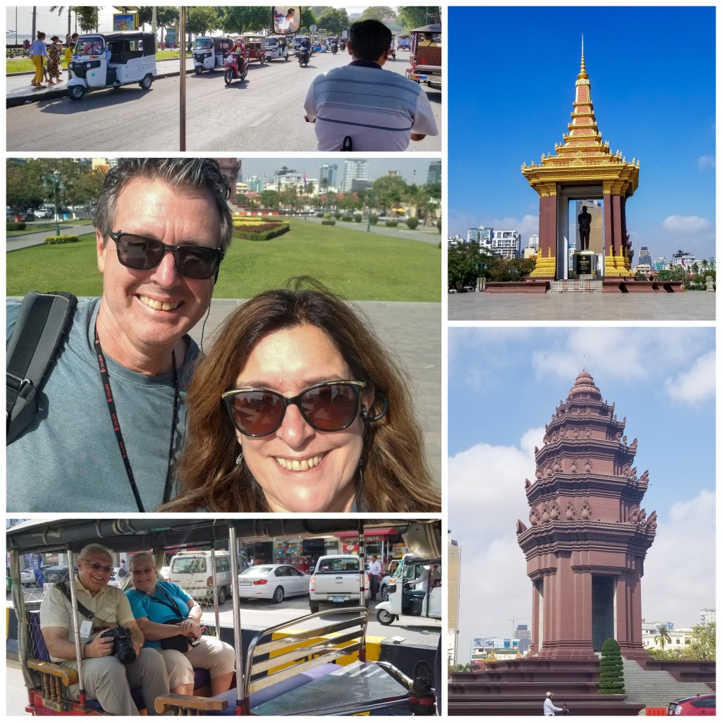 Habíamos quedado en el momento que el barco arribó al puerto de Phnom Penh la capital de Camboya y nuestra elección fue el recorrido de la ciudad en los tuk tuk, que son unas motitos con un carrito detrás. Sería algo así como un taxi pero a puertas abiertas o mejor dicho sin puertas, ni ventanillas 🙂 . Malísima mi descripción 🙂 . Muy divertido porque además estuvimos en el medio del tráfico rodeados de autos, bicicletas y obviamente otros tuk tuk, les muestro fotos donde se ven algunos de nuestros compañeros de viaje