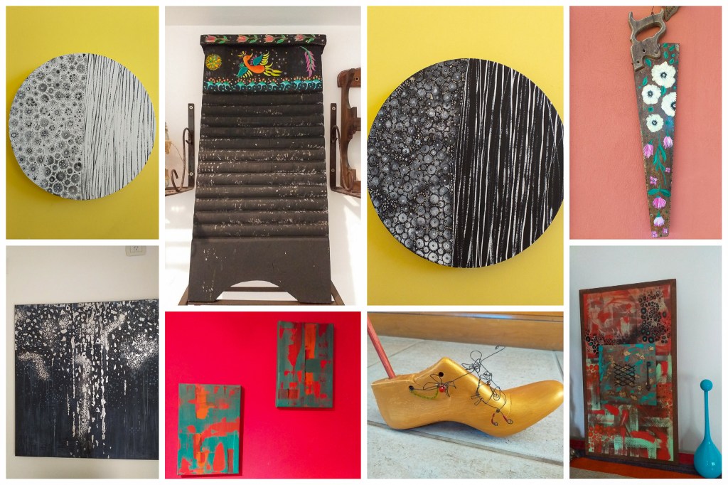 Me gusta explorar otras técnicas otros materiales. La mayoría de mis obras tienen un agregado especial…algunas pedacitos de vidrio… otras pequeñas partes de chapa…otras clavos….me gusta combinar materiales. También trabajo la pintura en la madera…con calados sobre la misma o reciclando, por ejemplo palets, obteniendo una mesa donde confluye la chapa el hierro y la pintura logré un accesorio único para la galería de mi casa.