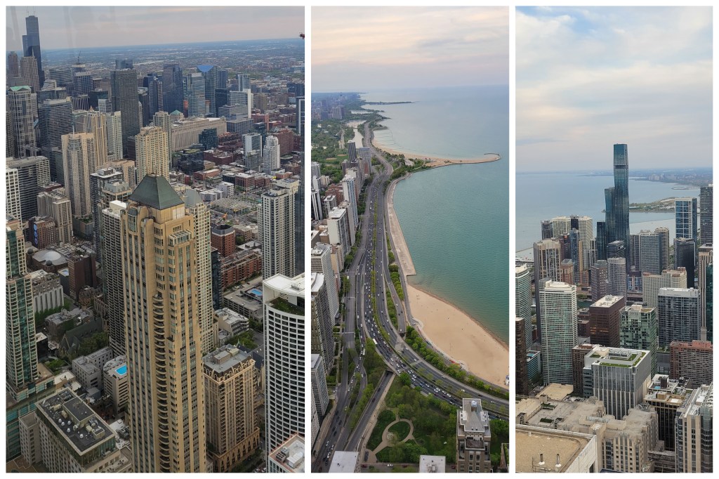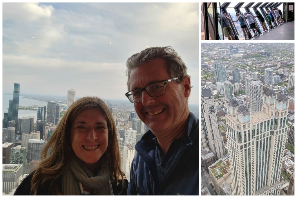 Para hacer el recorrido arquitectónico hay tres paseos obligatorios: uno es caminar la ciudad y en lo posible tomar algún paseo con guías. Otra manera es hacer uno de los tours en barco por el rio Chicago (ya te mostraré más en el próximo artículo) y la otra es subir a las torres más altas de la ciudad como la Willis Tower con 108 pisos y si te animas pararte en el Skydeck, que es una plataforma transparente donde podes experimentar la altura de una forma diferente. Otro edificio que te recomiendo es el 360 Chicago, 100 pisos con vistas a toda la ciudad por sus diferentes ventanales. Allí tienen algo llamado «tilt» que es una plataforma también transparente donde uno se apoya, se mueve hacia adelante y uno tiene cierta sensación de caída, nada grave, no te asustes 🙂 . Mi consejo es en estas cosas nunca mires directamente hacia abajo y de esa manera vas disfrutar de la experiencia y no padecerla 😉