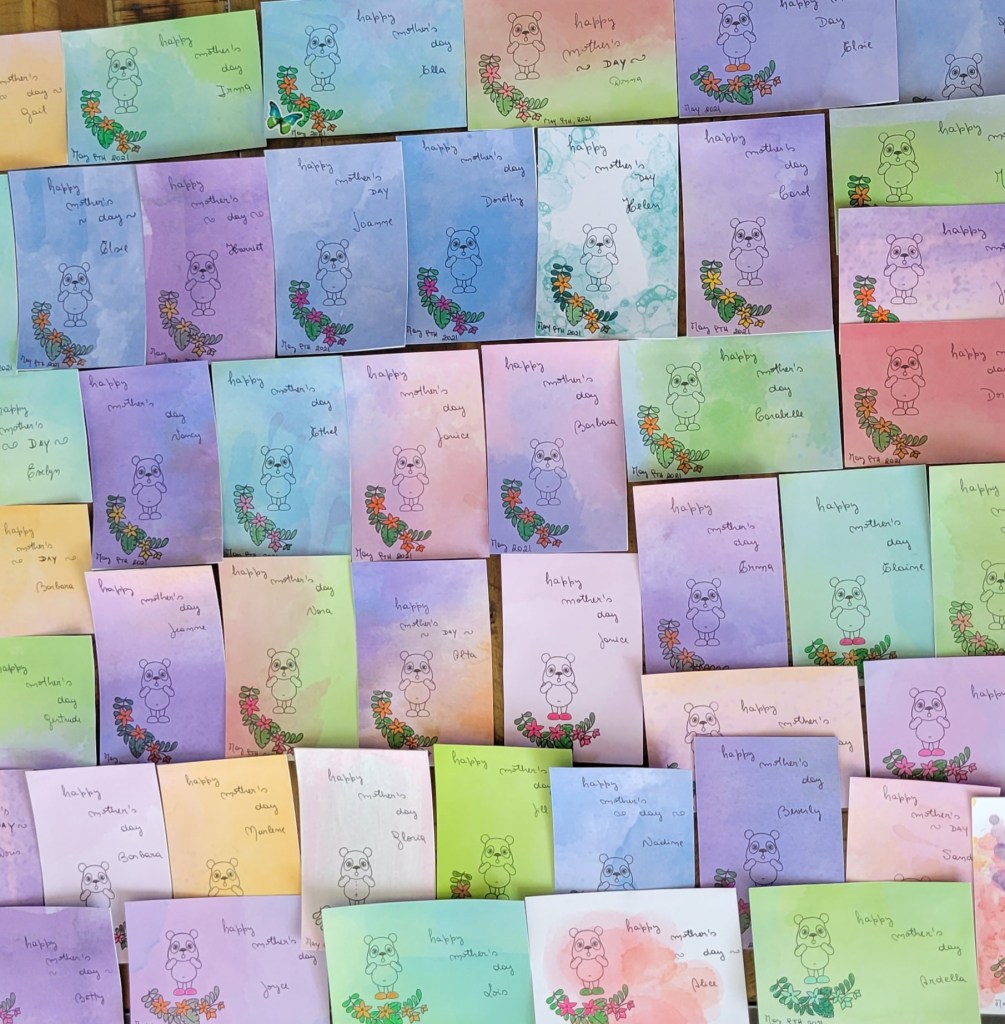 Not being able to stay quiet, I came up with two projects in which I did not know the people who would receive the cards. One was Mother’s Day, which here in the United States is celebrated in May. I chose a home for the elderly that is in the neighborhood where I live. I went to talk to the person in charge and asked her for the names of all the moms that live there. So I prepared a card for each of them with their names and selected pictures of flowers, making sure that they were all different. It was a hard project because I had to prepare 50 cards, but the joy I had of being able to distribute them (because Linda was kind enough to let me do it) and seeing those happy faces were the reward for so much effort 🙂