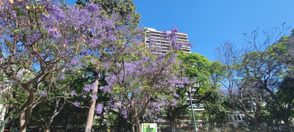 Puedo decir y sin temor a equivocarme que la primavera es la estación más linda de Buenos Aires; por la temperatura, por la cantidad de flores y especialmente por los jacarandás que son unos árboles que colorean de lila muchas de las calles durante el mes de noviembre. Los amo y me pone feliz volver a verlos.