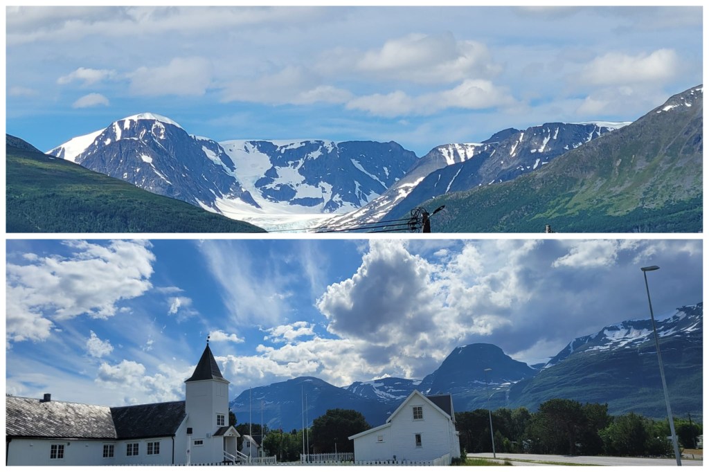 The next adventure was to find a place to have lunch and after a lot of searching we arrived at a simple place with mountains, a view of a glacier and a sky adorned with beautiful clouds. We ordered something simple sausages that we assumed would come in a bun (hotdog) and potatoes. The surprise was how they were served: cut sausages mixed with a potato of uncertain cooking and that mixture was something impossible to eat. Maybe you heard that Norwegians don’t specialize in good cuisine (this said by themselves) and that «dish» was the proof. Too bad I didn’t take a picture, but I think it was too strong a sight plus taste.