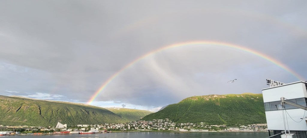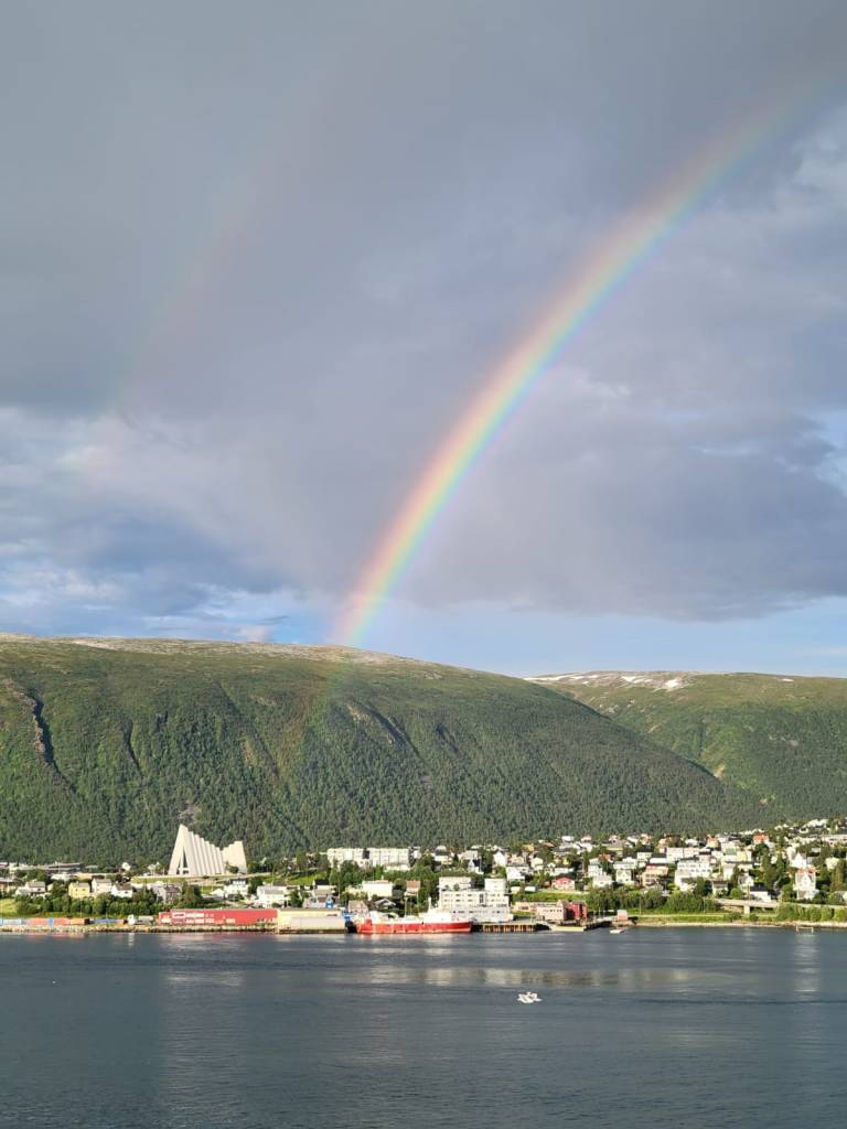 La contrapartida es que en los meses de invierno lo que no aparece es el sol y no me quiero imaginar lo fría que debe ser esa parte del mundo. Sin embargo visitar Tromsø en invierno parece ser el plan ideal para ver Auroras boreales, un fenómeno realmente mágico y que me gustaría volver a ver en otra ocasión. No sé si esto está relacionado o no con la ubicación de la ciudad tan al norte del planeta, pero me llamaron la atención los colores súper intensos de los arcoiris y este de la foto parecía querer quedarse en el cielo para siempre 🙂 ; algo que disfruté de una manera especial porque me encantan y siempre me parecen efímeros.