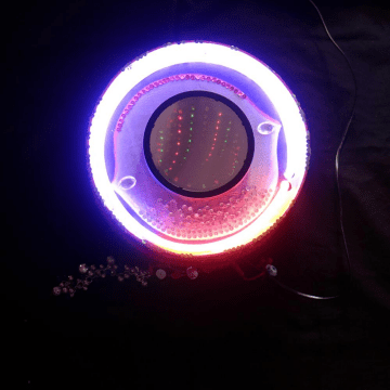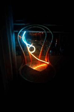 She also experimented with neon and belongs to the group NEÓN ART NEÓN. At this stage he started from a round wooden box titled «The eye that sees everything», then he made several works, among them we can mention: a tonet chair titled «DNA», because it belonged to his grandparents and the neon light and mirrors together with the colors he used, reflect and follow a visual path referring to DNA.