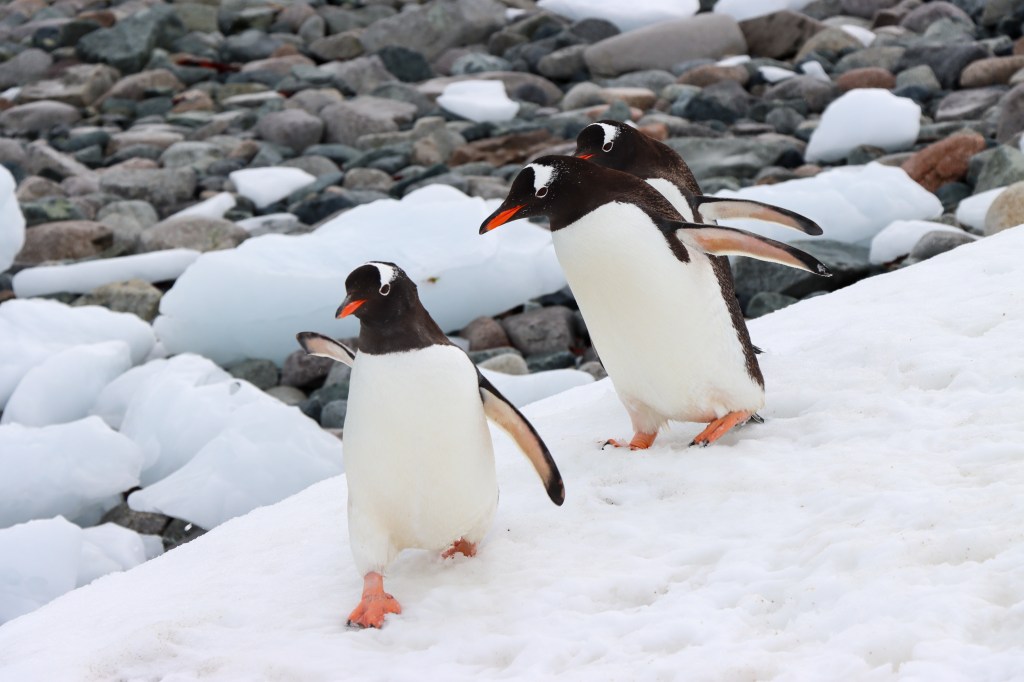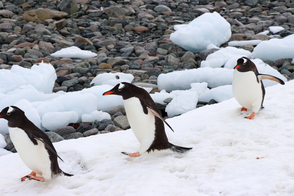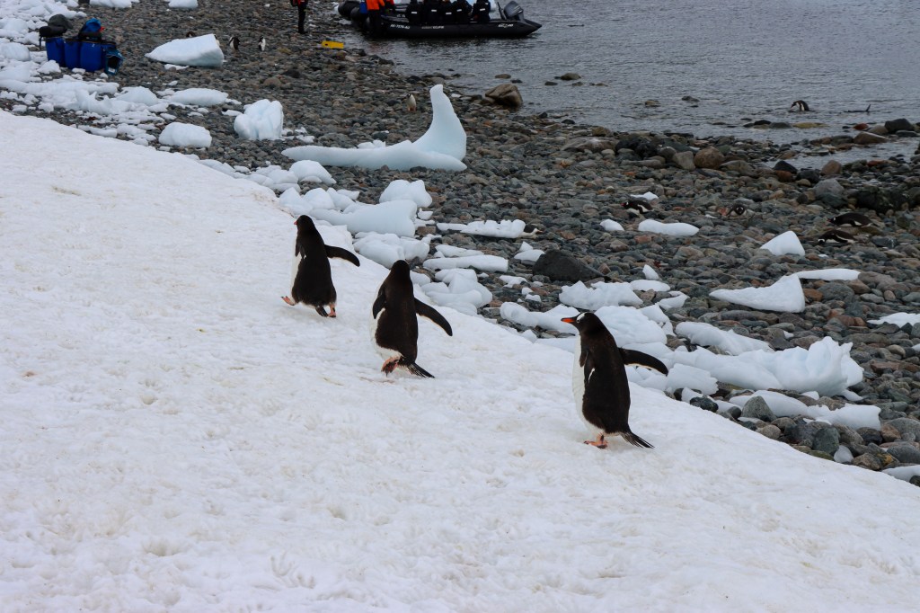 Y cuando quedé sola, a un costado reponiéndome de tanta emoción, aparecieron estos tres pingüinos papúa (gentoo) que comenzaron a acercarse y cuando saqué la cámara, el primero de la fila levantó su alita a modo de saludo. Miro la foto y vuelvo a sonreír como en aquel momento 😍🐧