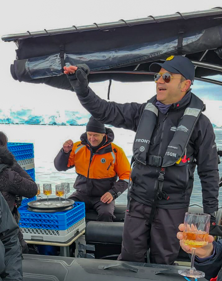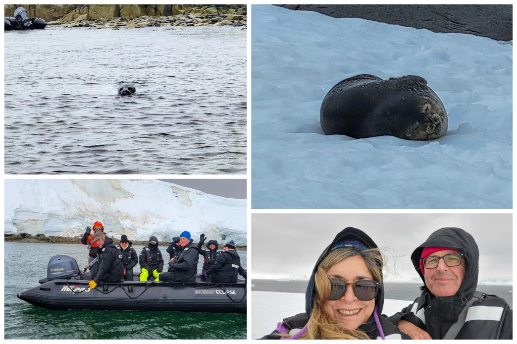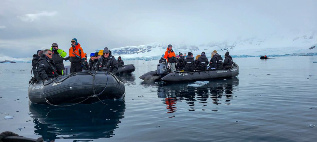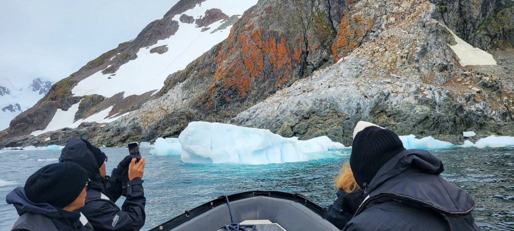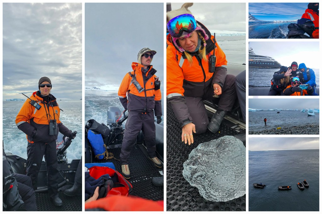 Ninguno de esos paseos hubiera sido posible si no hubiéramos contado con la destreza y experiencia de nuestros «ángeles de la guarda», que eran quienes manejaban los zodiacs, los botes que nos transportaban en cada excursión. Su tarea no era simplemente llevarnos y traernos, sino ir primero explorar el área que visitaríamos, chequear que el mar estuviera navegable, demarcar las rutas donde podríamos caminar para no interferir con la fauna del lugar, preparar los bastones en lugares donde estaríamos sobre hielo y además contestar a las preguntas que pudiéramos tener sobre los lugares visitados. Y como si esto fuera poco durante las travesías muchos de ellos impartían conferencias sobre diferentes temas relacionados con el medio ambiente, fauna y hasta talleres de acuarelas👏👏.