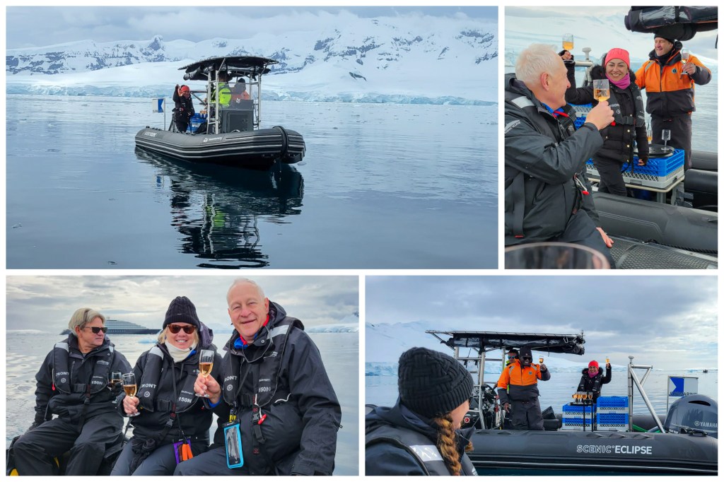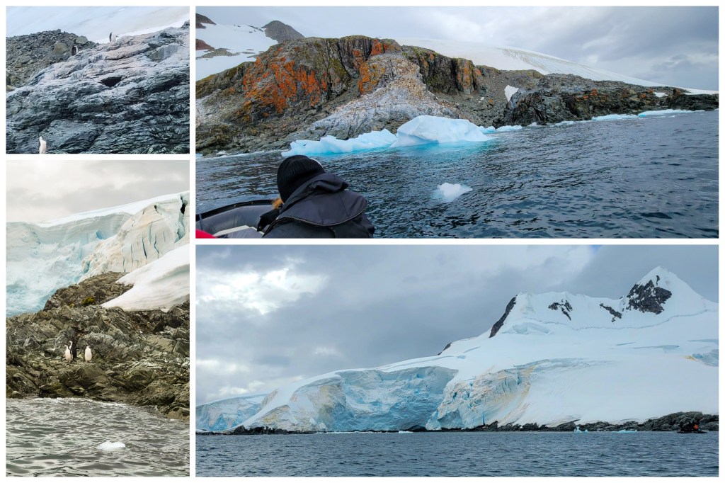 Y llegamos a Fournier Bay y el tiempo era tan agradable y soleado que todos estábamos felices y de muy buen humor. Apenas comenzó el paseo hicimos una parada técnica al lado de un pequeño barquito donde nos sirvieron una copa de espumante y mientras que íbamos disfrutándola vimos a estos pingüinos de barbijo (chinstrap) que también estaban también muy entusiasmados disfrutando del día.