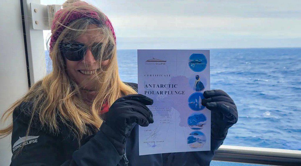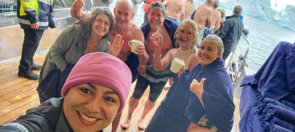 Durante la navegación comenzó a hablarse del «Antarctic Polar Plunge» que es zambullirse en el mar una vez que cruzáramos el Círculo Polar Antártico. La idea empezó a rondarme en la cabeza y vos pensarás cuál es la diferencia entre caerse de una tabla con un traje neopreno a tirarse al agua en traje de baño 🤔🤔. La respuesta es la decisión de hacerlo 😉 🙃🥶