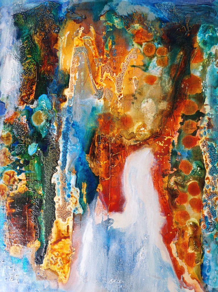 About the materials or tools that I use, it’s hard to pick just one, so I won’t 🙂 . I will share with you my top five. I really like the results I get from liquid watercolors. They will reactivate with water once they are dry so you can create some dramatic results. Unlike watercolors, Inktense products will not reactivate once they are put down on your surface. I like Inktense blocks and pencils, although I tend to reach for my blocks more often than the pencils. Neocolor crayons are fun and easy to use. They are color crayons for adults. Golden Fluid Acrylics are expensive, but worth the cost. I have been buying them slowly as the cost can be overwhelming. The rich colors are intense and they go a long way. Acrylic Inks are amazing! I love to paint with them, use them to add drips and splatters, and use them to layer my work.
