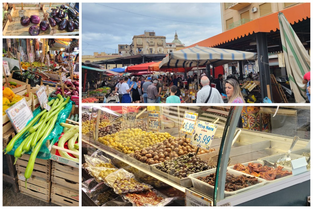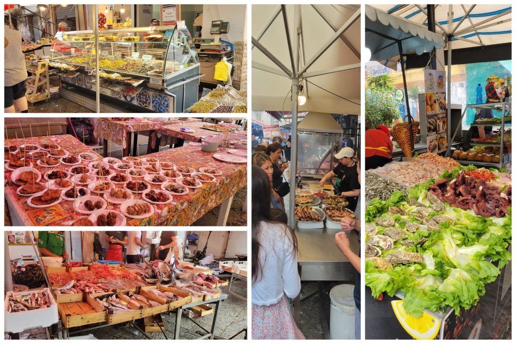 Teníamos mucha curiosidad por visitar los mercados de la ciudad y uno de los más recomendados era el de Ballarò por ser uno de los más antiguos de la isla. Al llegar nos encontramos con varias cuadras con diferentes puestos de comidas y lo llamativo fue que la mayoría de los productos no estaban refrigerados a pesar del calor y la humedad. Había muchísima gente recorriéndolo mezclada con los gritos, canciones y hasta bailes de los puesteros para llamar la atención. Todo me pareció demasiado estridente: peces espada colgando semi faenados, pulpitos apoyados en una mesa nada tentadores aunque la parte de las verduras frescas con sus colores vivos captaron mi atención, tomates, limones, los zucchinis, berenjenas y aceitunas enormes.