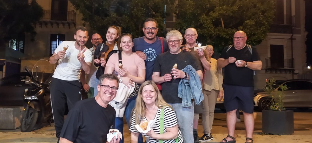 De cualquier manera la mejor sorpresa vino de la mano de la gente 🙂 . Barnaby contrató un tour de comida callejera y nos encontramos con Claudio un gran anfitrión que llevó al Mercado Vucciria de noche. En su recorrido nos contó historias de la ciudad mezcladas con anécdotas familiares y además con su risa contagiosa y buena predisposición consiguió que por unas horas nos olvidáramos de las valijas perdidas.