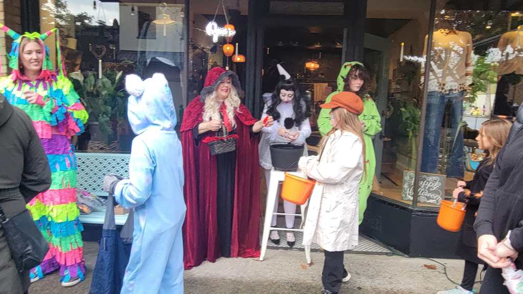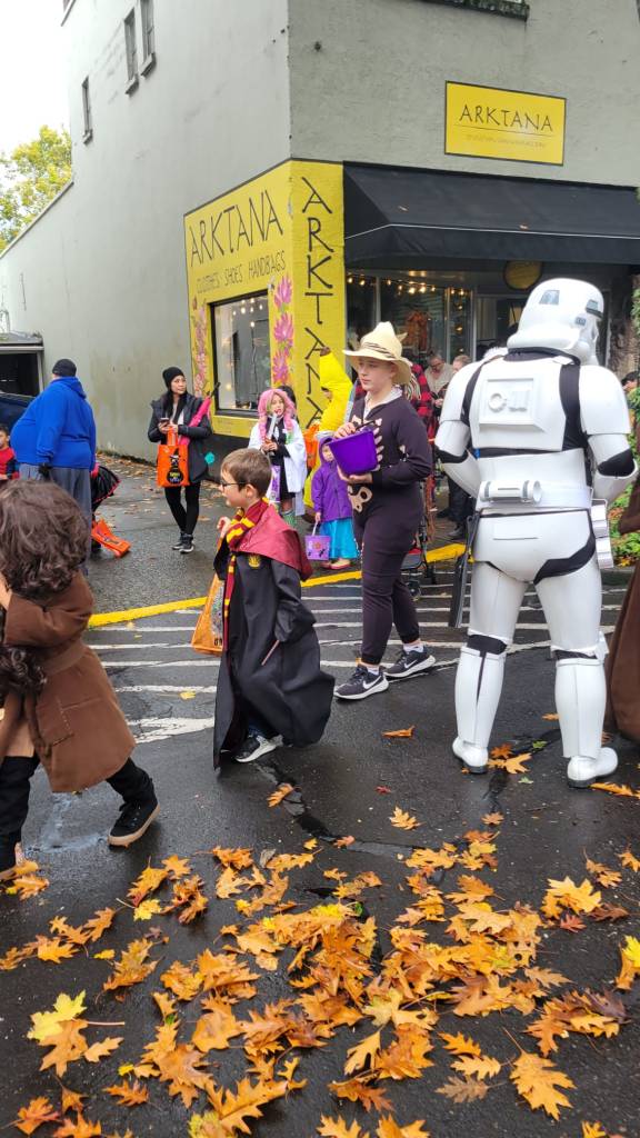 There I found the streets closed and a large group of kids in costumes going through the stores looking for candy.