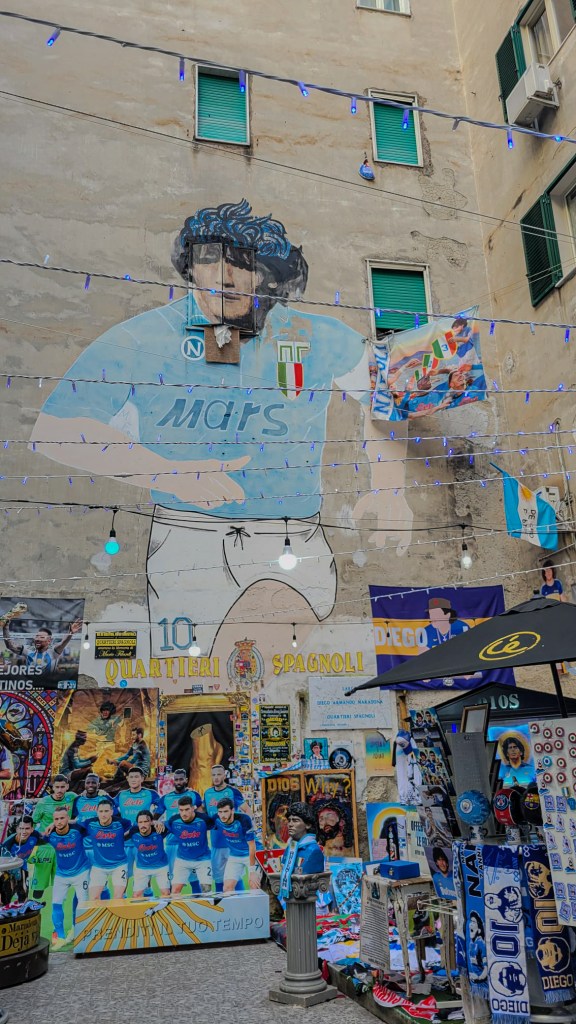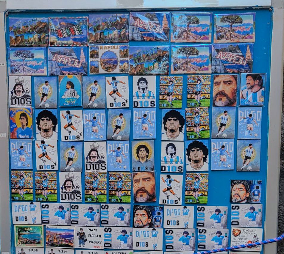 Devotion to Maradona can be felt in every corner of the city. Murals, figures, T-shirts, magnets and even the light blue Maradona Spritz, like the Napoli jersey, are witnesses of this huge admiration.