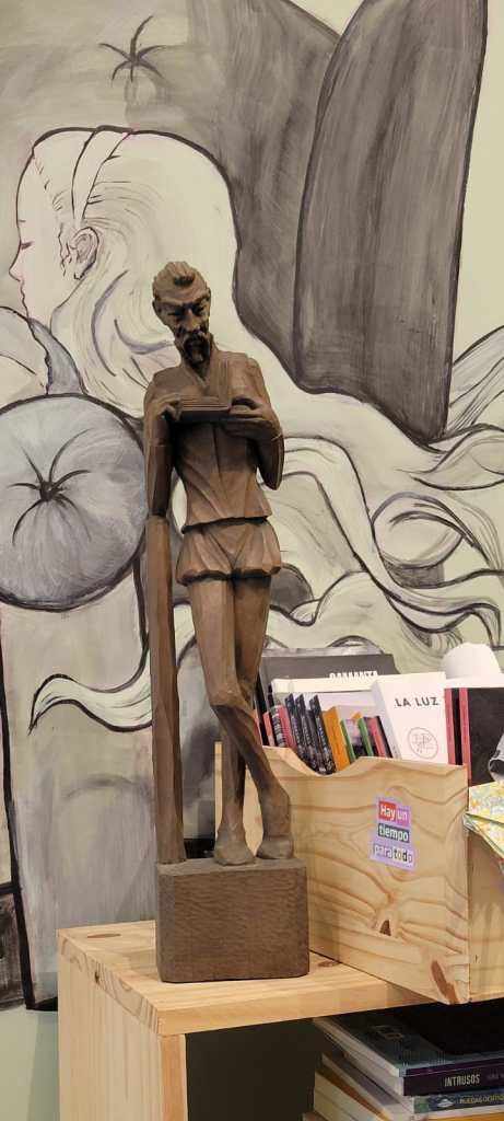 There are books arranged on shelves and tables, one of them was her grandmother’s sewing machine. I seaw and asked about a sculpture of a Martin Fierro reader carved in wood; Laura told me that it was a gift from a client who felt accompanied by the recommendations and coffees she had at Leeme Mucho while she was going through a difficult personal moment.