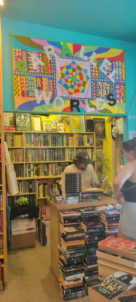 When I arrived I found a shop painted in a vibrant blue and a table outside with a selection of used books. Its window display with books on display and a T-shirt hanging with the Parallel Worlds logo completed the landscape of this eye-catching place.