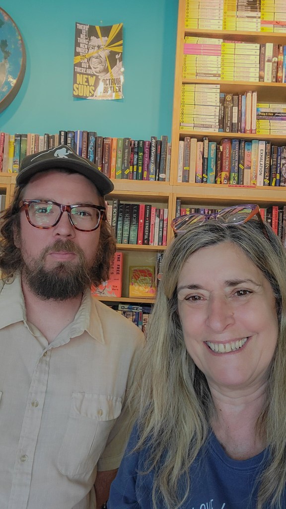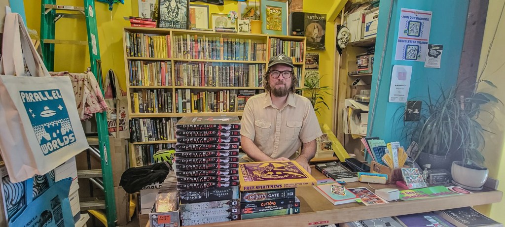 Sam me contó que Parallel Worlds abrió sus puertas en 2022, al principio con muy pocos libros, algo que viéndolo hoy parece imposible. Tiene una cuidada selección de libros, que incluye a los autores clásicos de ciencia ficción y fantasía pero con el foco puesto en autoras mujeres, queer y en personas que no se perciben blancas.