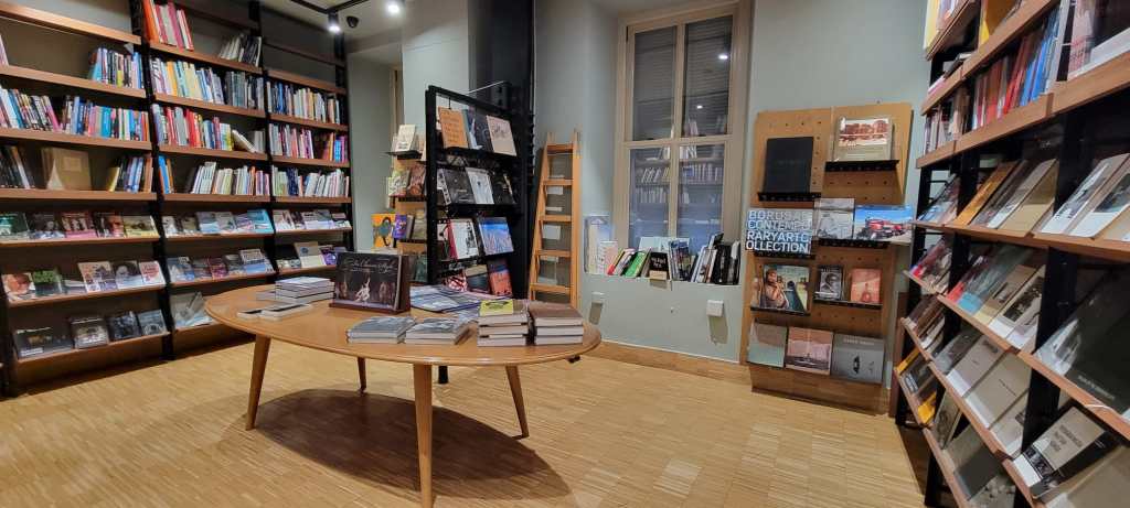 Otra librería destacada fue Robinson Crusoe 389 https://www.instagram.com/robinsoncrusoe389/, un espacio de estilo moderno dentro del Salt Galata. La librería cuenta con amplias salas, donde muchos de los libros de arte y arquitectura están dispuestos de frente, lo que facilita que los visitantes puedan hojearlos y mesas para poder desplegarlos.