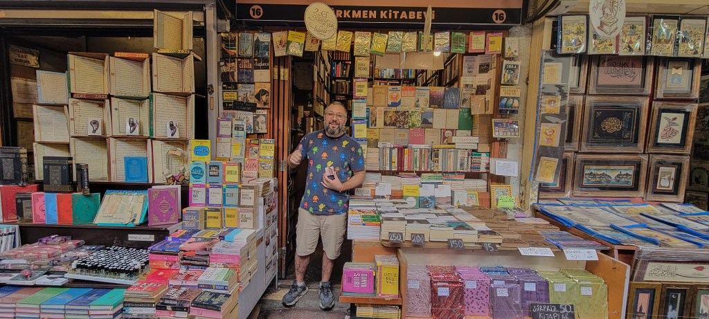 Fue entonces que conocí a Sezar https://www.instagram.com/amazonsahaf/, un librero con quien tuve la suerte de conversar un rato. Su tienda es un negocio familiar con casi cien años de historia, y me contó con orgullo lo significativo que es para él continuar con este legado. Desde pequeño había soñado con seguir al frente del negocio, y ser librero, según sus palabras, es mucho más que un trabajo: es una verdadera pasión que atraviesa culturas.