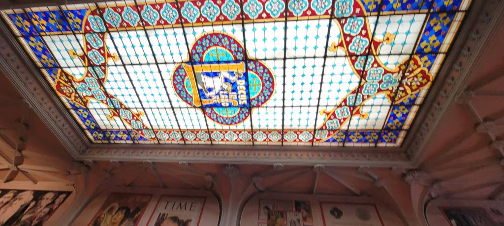 When I climbed to the first floor, what immediately caught my attention was the impressive stained-glass skylight (designed by Samuel Van Krieken), which covers much of the ceiling. It features the Latin phrase Decus in Labore (“Dignity in Work”) and includes the bookstore’s emblem as its central symbol.