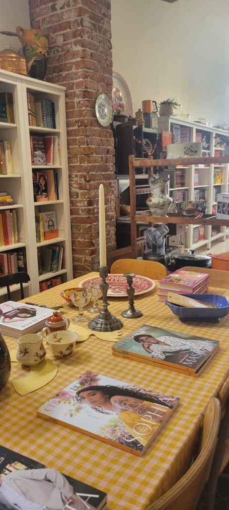 Inside, the space is bright and airy: shelves with both new and used books, a beautifully set dining table as if awaiting guests, aprons hanging, and tables with pots, pans, and utensils.