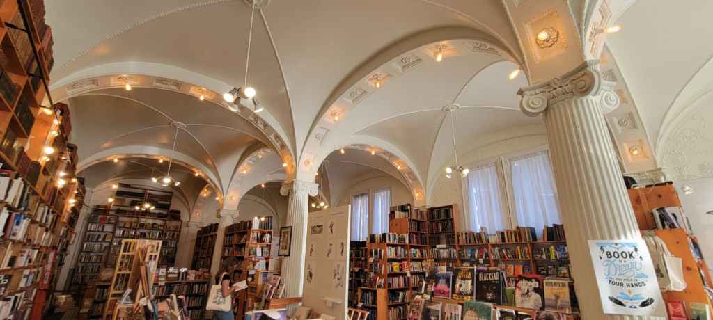 On a sunny Sunday, I visited Arundel, the bookstore located on the corner of an impeccably preserved old building. Its large windows invite you to enter, and once inside, the white columns, domed ceilings, and neat shelves create an elegant atmosphere, with an air of solemnity and good taste that surrounds the entire space. Although the real stars there are the books and art.