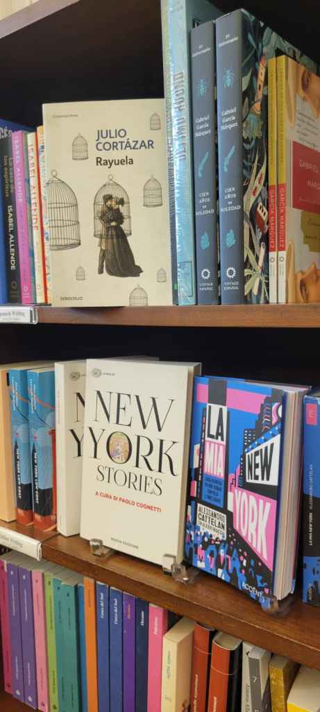 On its shelves, titles on literature, history, and essays coexist alongside a selection of books in French, Italian, and Spanish, where I once again encountered Julio Cortázar’s Rayuela, this time in its original language, although I never stop being surprised every time I find it translated into so many languages.